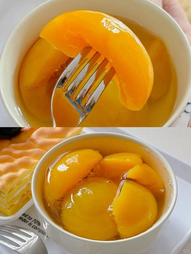 黄桃罐头里面是一大块完整的黄桃果肉,吃起来是软中带脆的口感,酸甜度也适中。橘子罐头更是口口爆汁,好吃到不行!