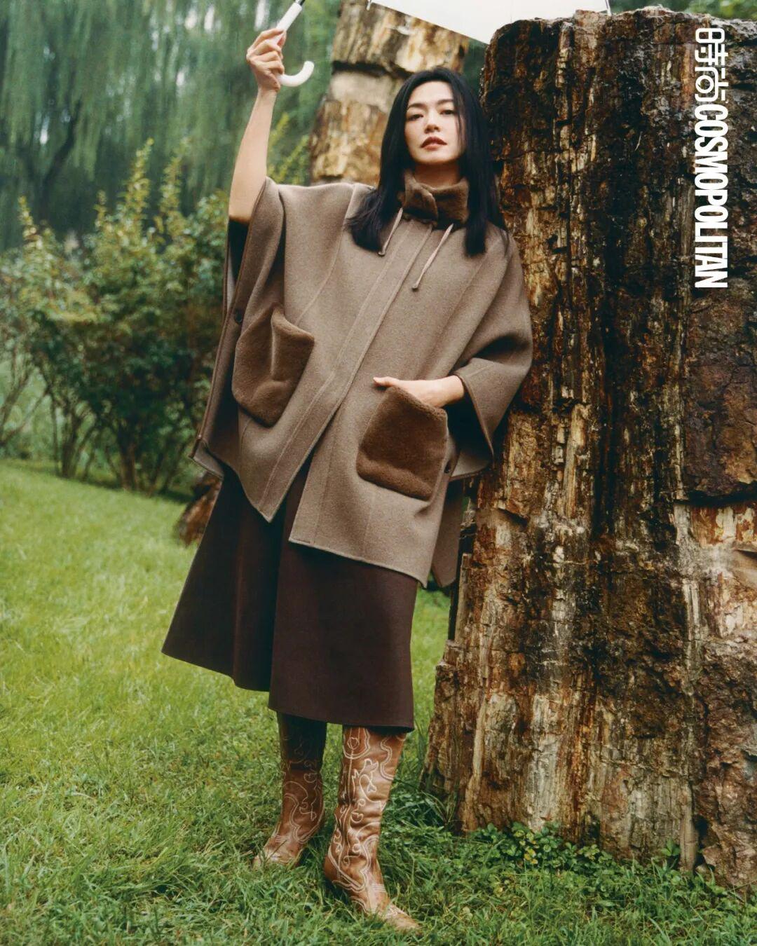就像这次拍摄进行到一半的时候,一场大雨毫无征兆地落下,细密的雨丝安静而无差别地落到土地、枝丫和每个人的头顶上。空气浸润着潮湿的分子,雨雾仿佛将她捎回南方家乡,回到在街巷踩水的童年时光。姚晨半倚在一段经历数百万年才形成的硅化木上,微微仰着头看向天空。“这就像经历了一场梦游。”她说。