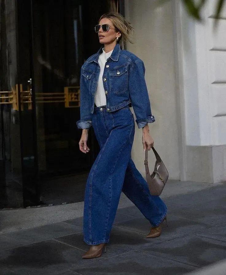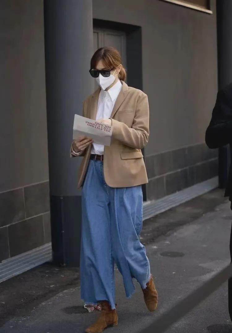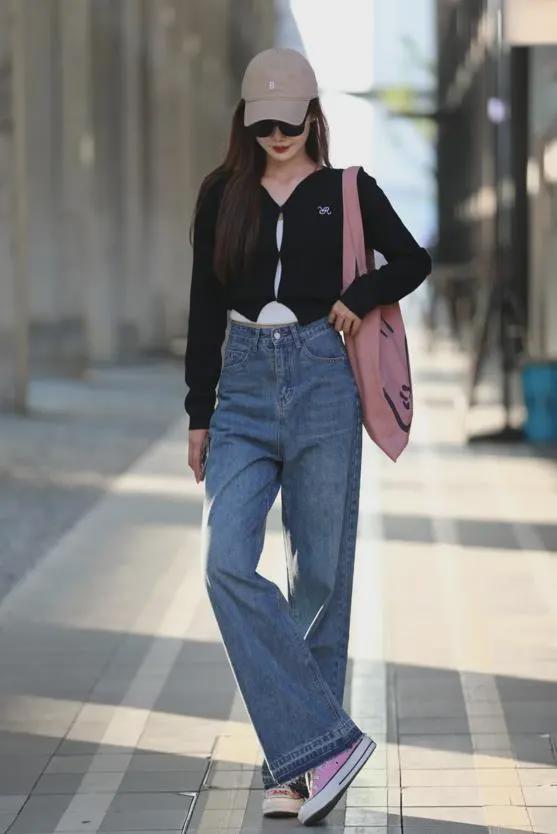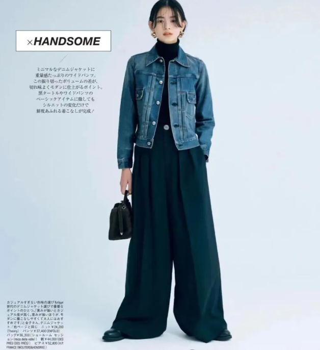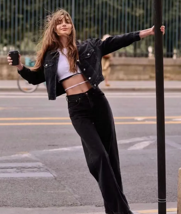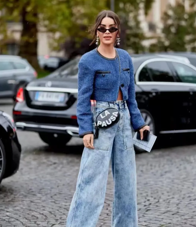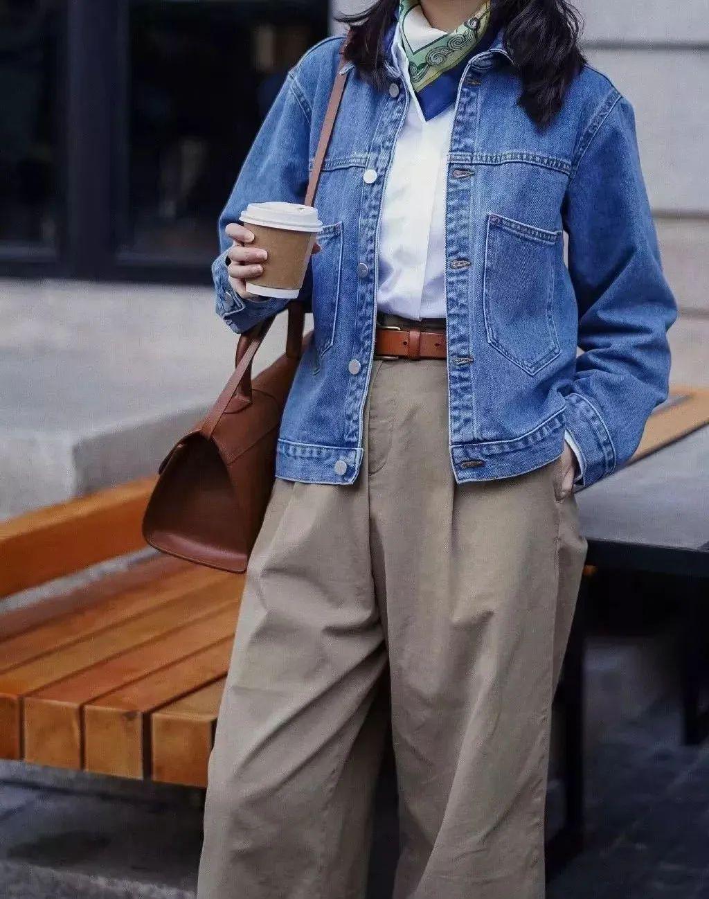 短牛仔外套的短款设计能够巧妙地提升腰线,拉长腿部线条,而阔腿裤的宽松裤腿则进一步修饰了腿部曲线,营造出一种既高挑又修长的视觉效果。