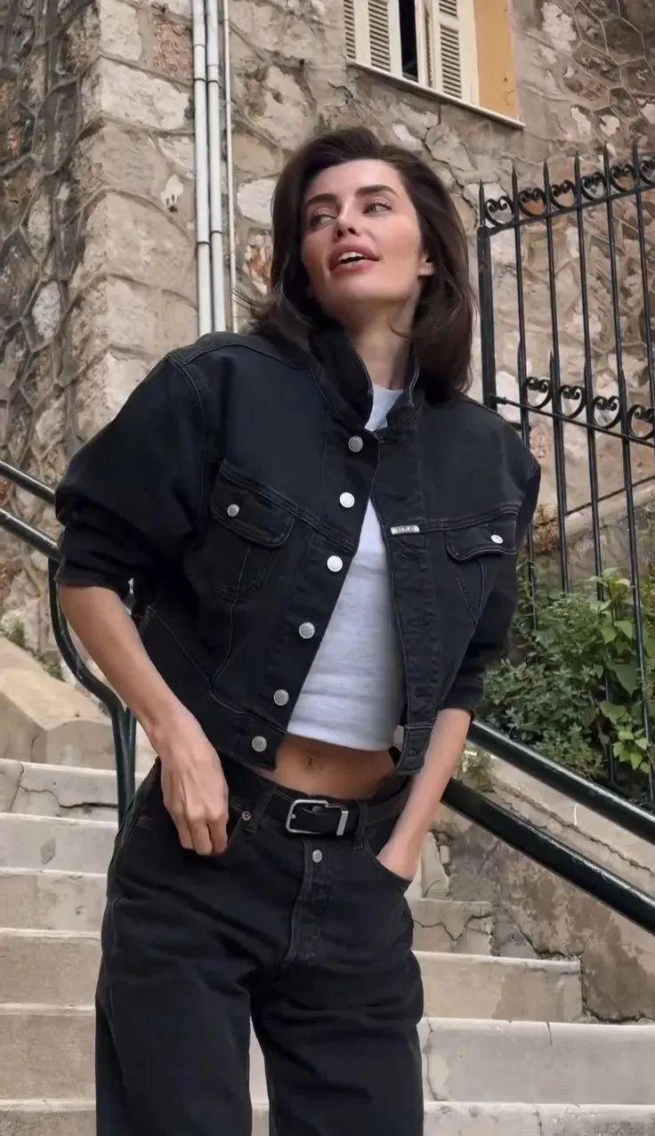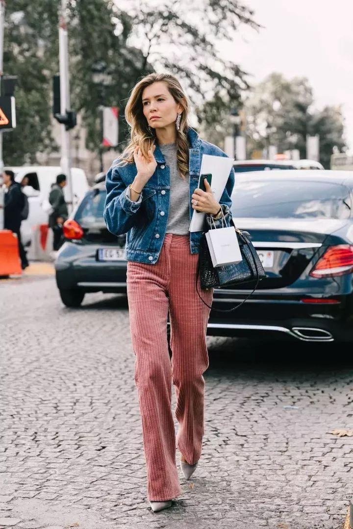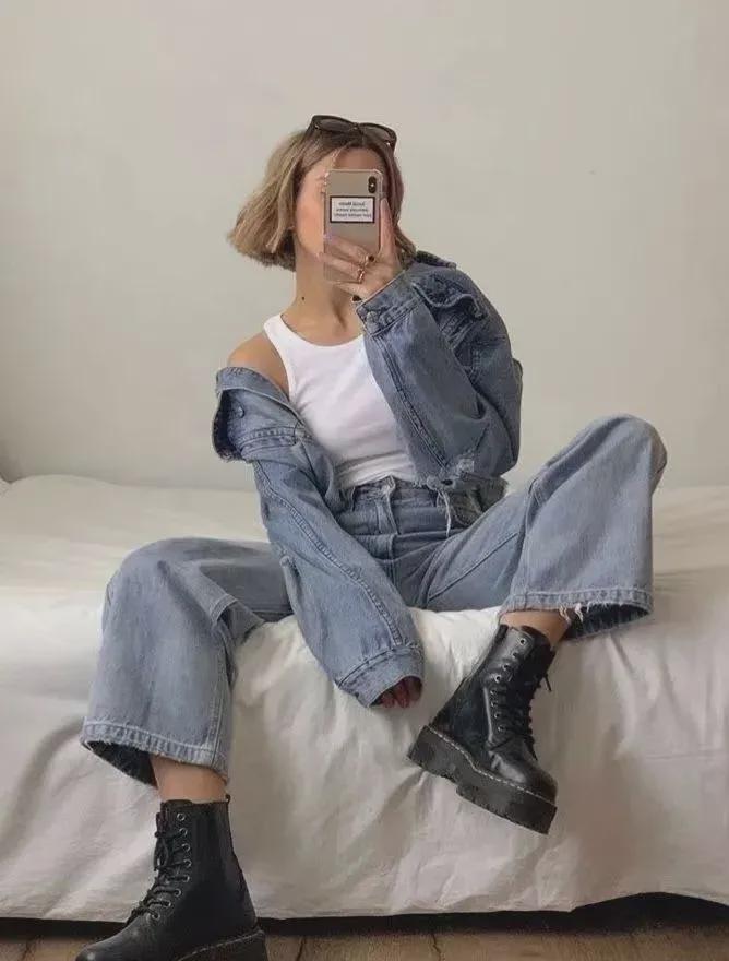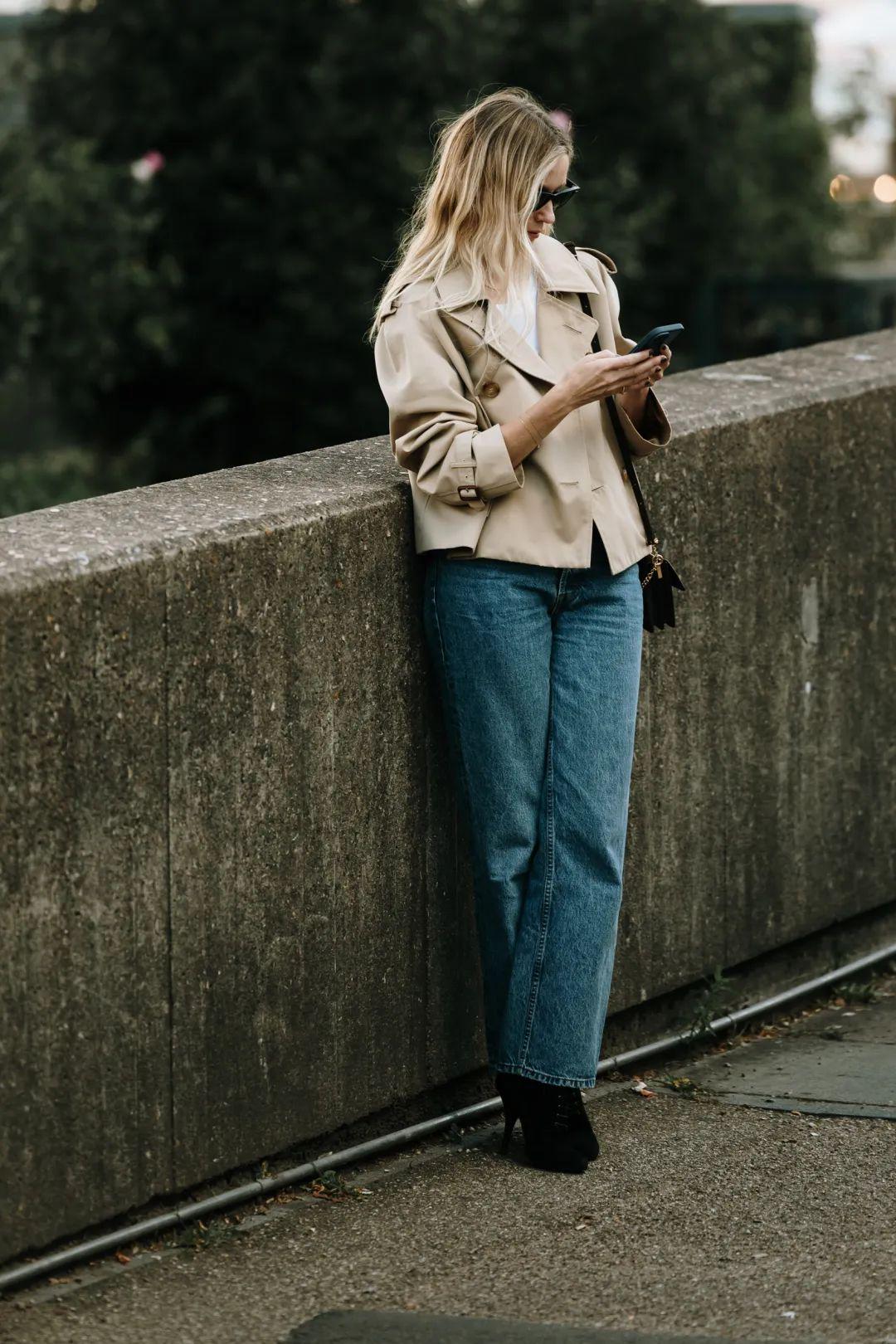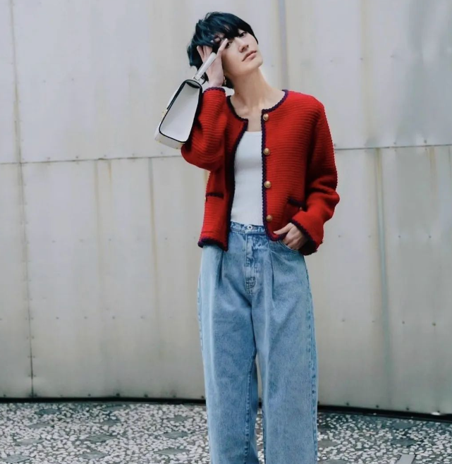 短牛仔外套的短款设计能够巧妙地提升腰线,拉长腿部线条,而阔腿裤的宽松裤腿则进一步修饰了腿部曲线,营造出一种既高挑又修长的视觉效果。