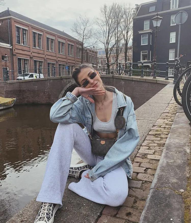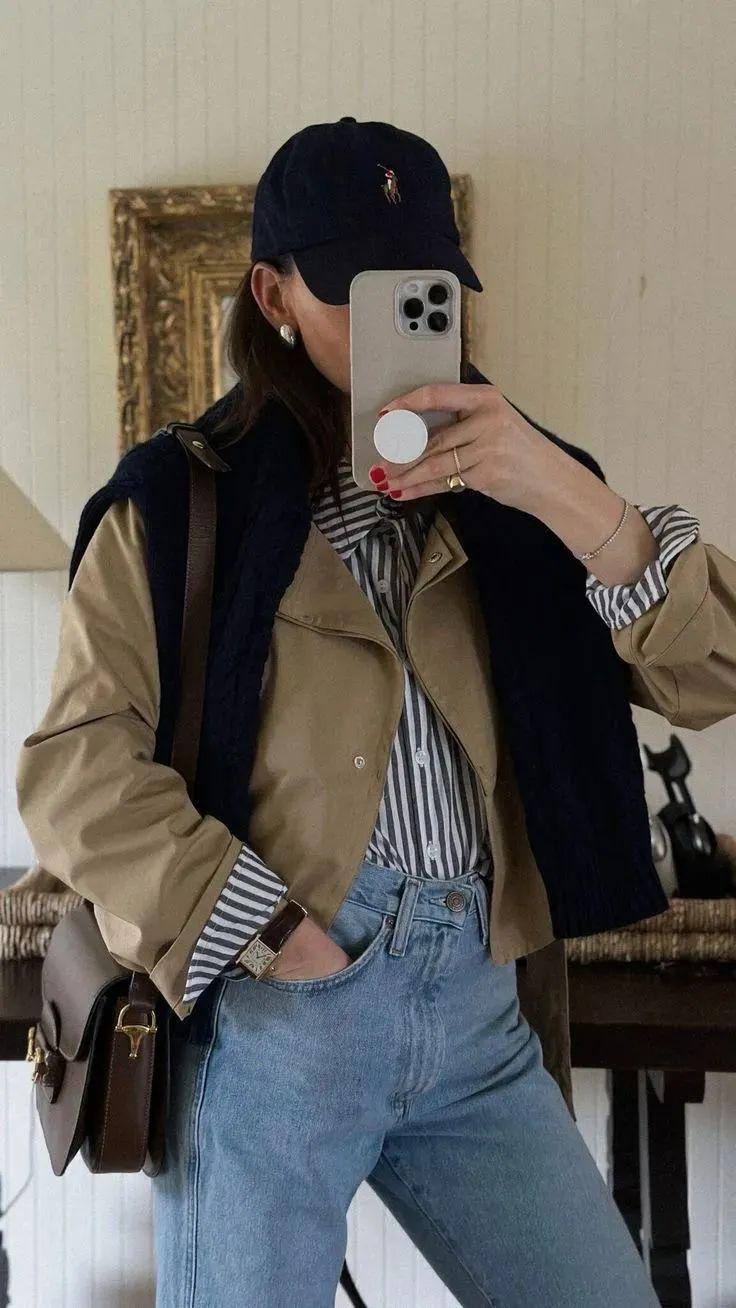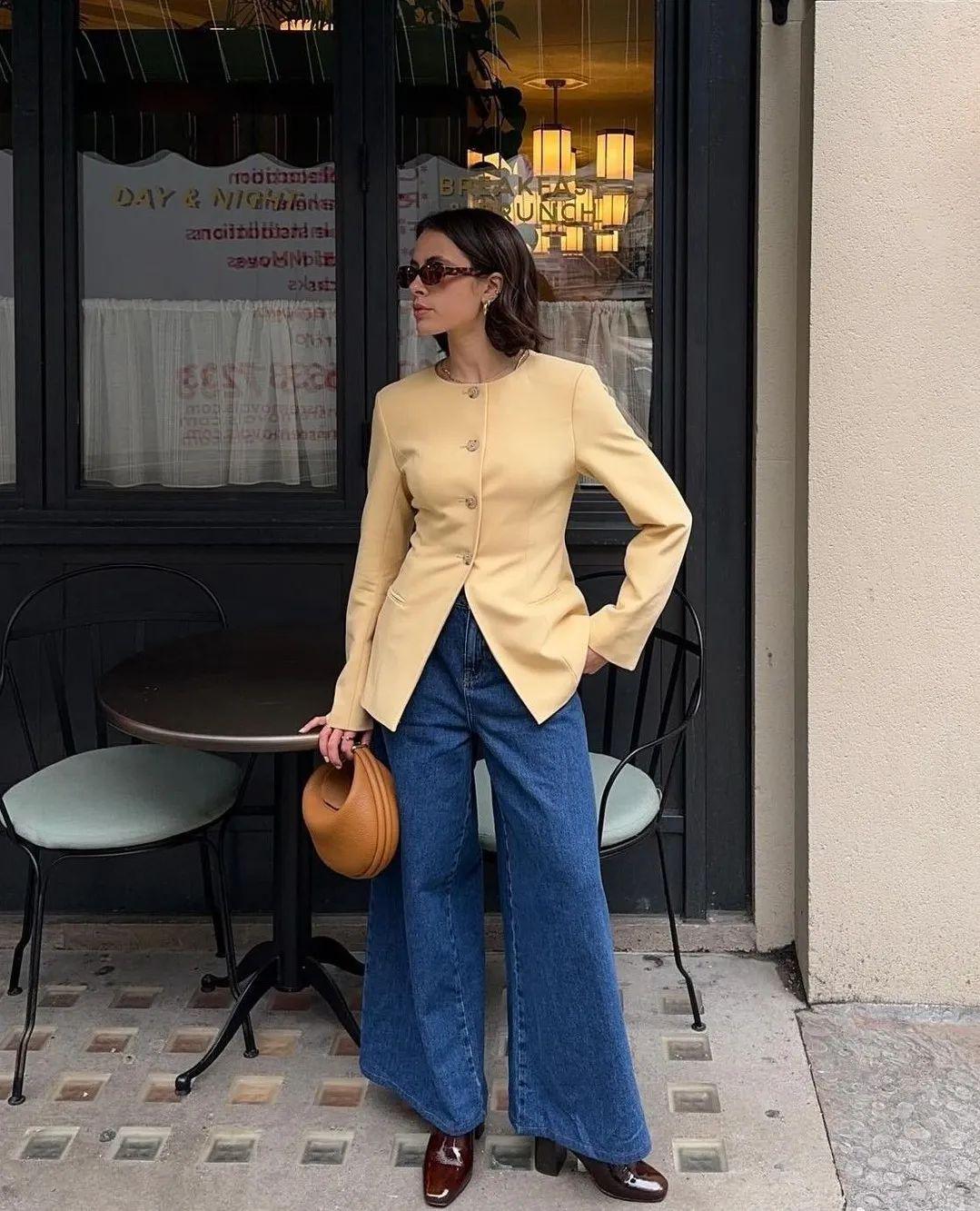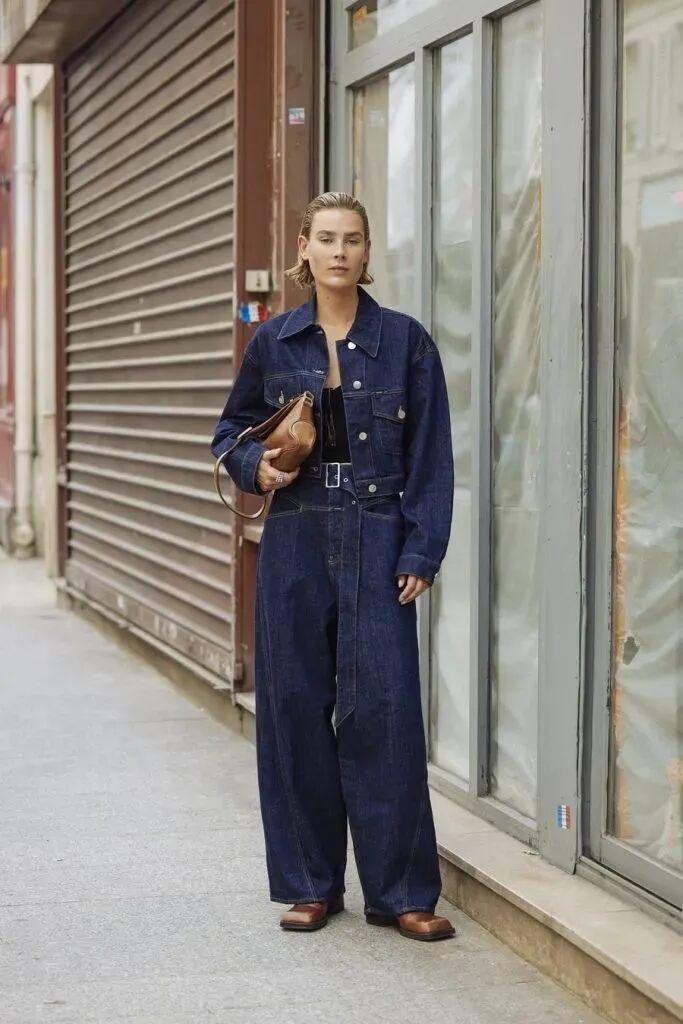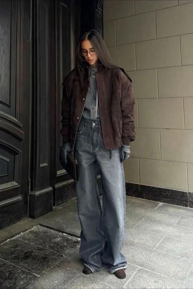 短牛仔外套的短款设计能够巧妙地提升腰线,拉长腿部线条,而阔腿裤的宽松裤腿则进一步修饰了腿部曲线,营造出一种既高挑又修长的视觉效果。