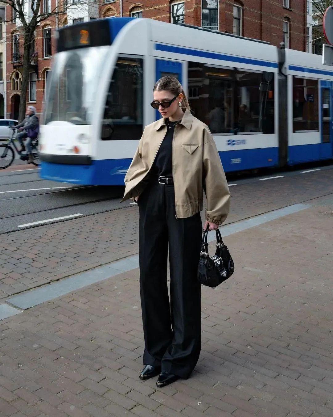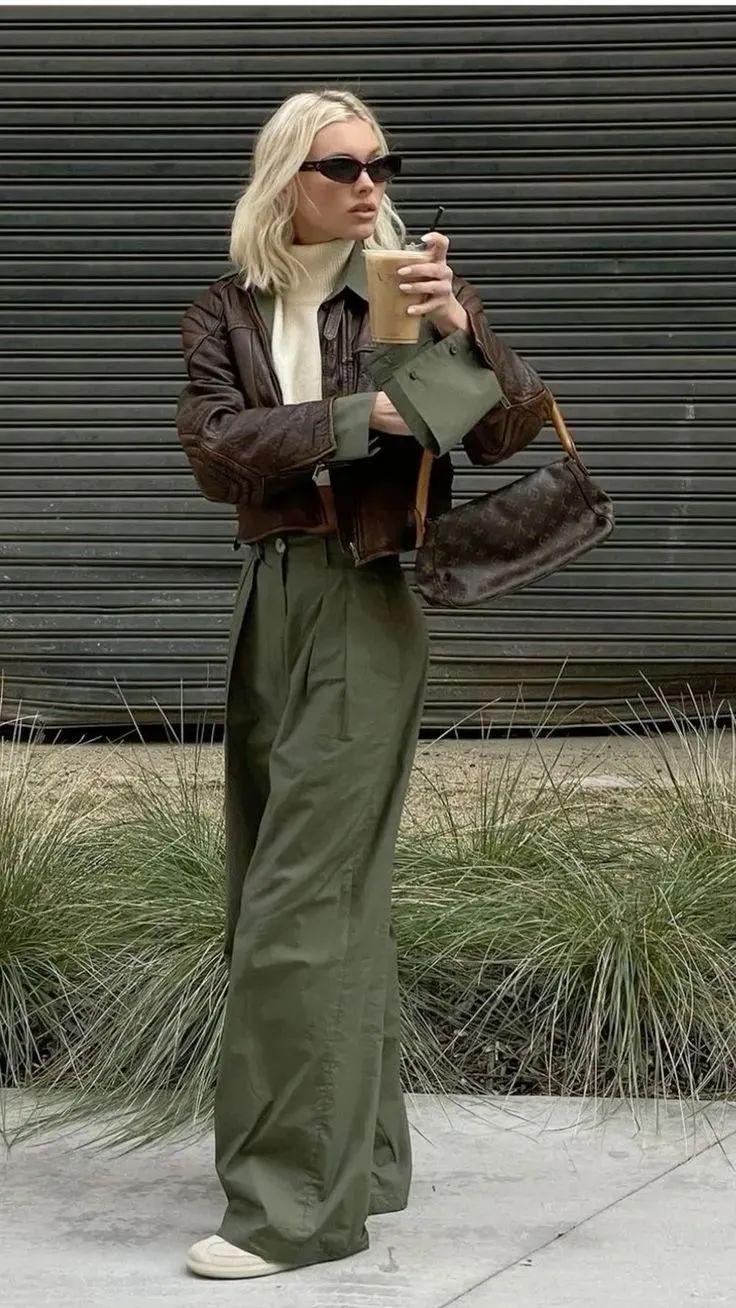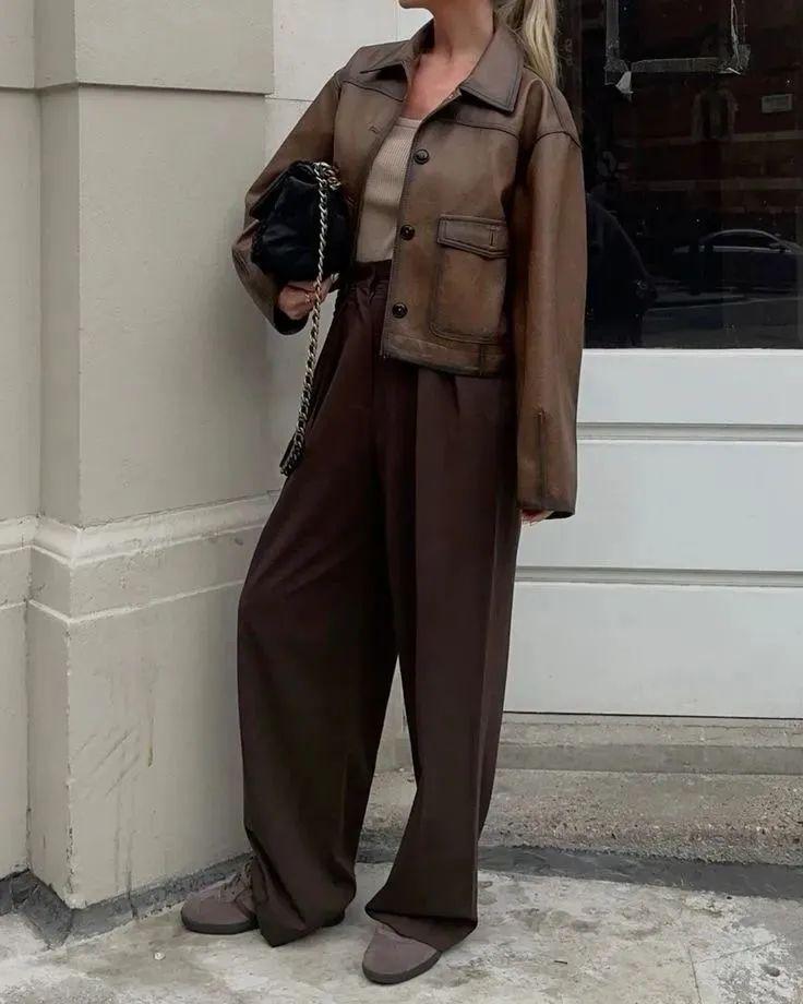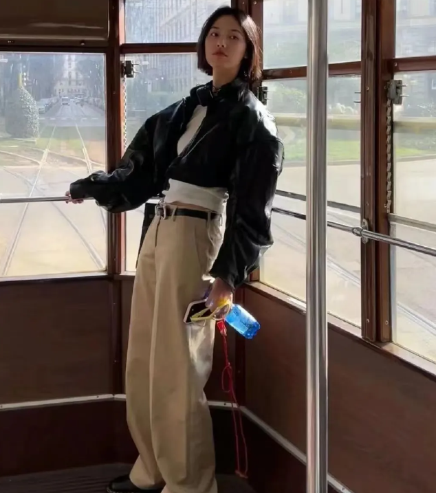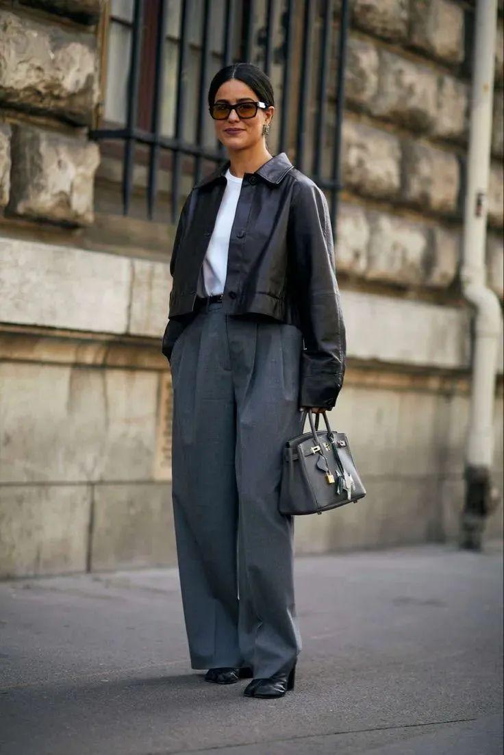 短夹克与阔腿裤的搭配是一种集时尚、休闲与个性于一身的穿搭组合。这种搭配不仅展现了穿着者的独特品味,还彰显了其自信从容的生活态度。