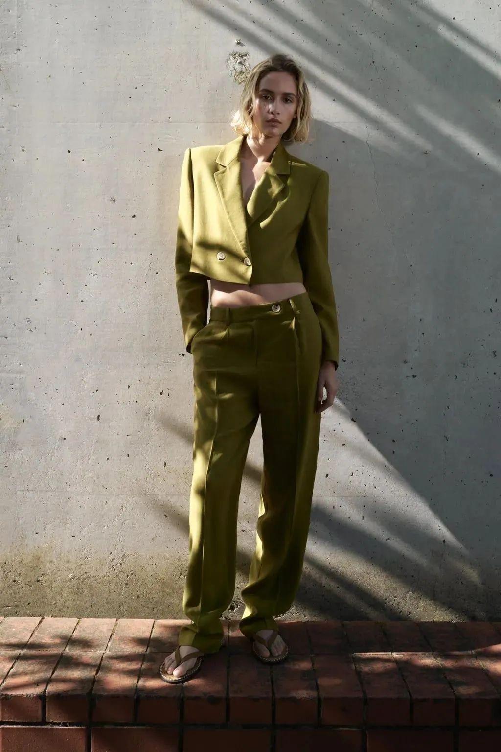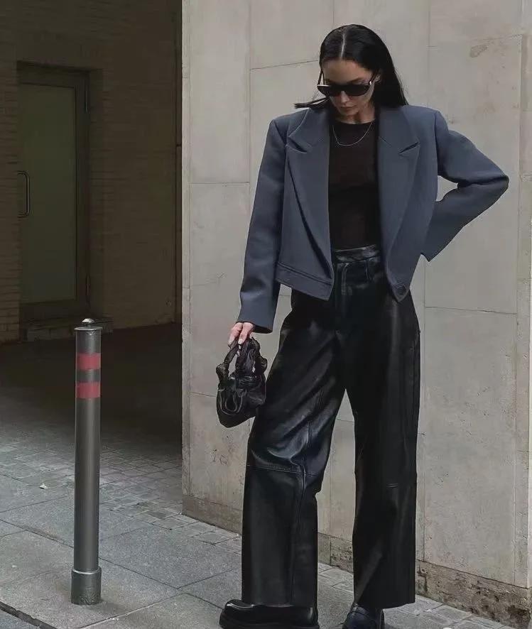 短西装与阔腿裤的搭配是一种既时尚又充满个性的组合,完美融合了职场干练与街头潮流的元素。