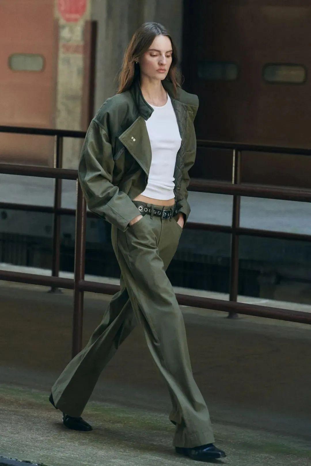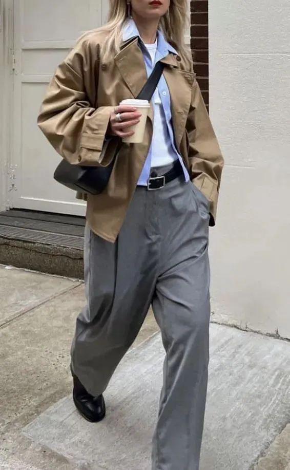 短风衣的利落剪裁与阔腿裤的流畅线条相互映衬,共同打造出一种既高级又时尚的氛围,让穿着者在人群中脱颖而出,成为众人瞩目的焦点。