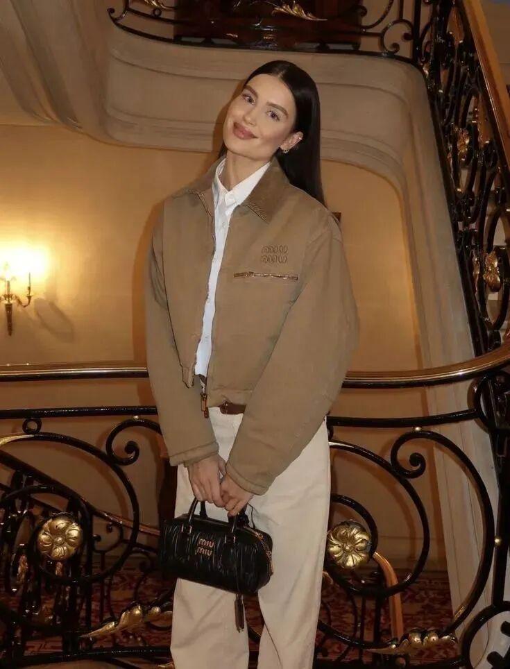 同时,阔腿裤的飘逸质感与短皮衣的硬朗风格形成了鲜明的对比,这种碰撞与融合,让整体造型更加富有层次感和动态美。