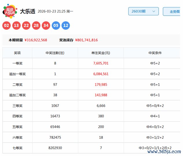 大乐透第2026030期开出奖号为:02、13、22、28、34+05、12。其中前区奇偶比为1:4,三区比为1:2:2,大小比为3:2,后区开出一奇一偶组合。